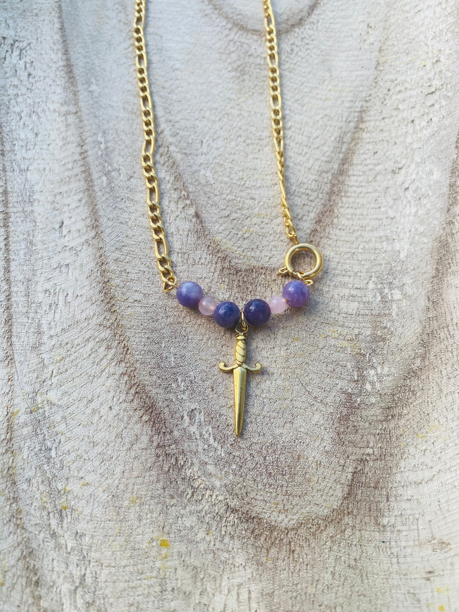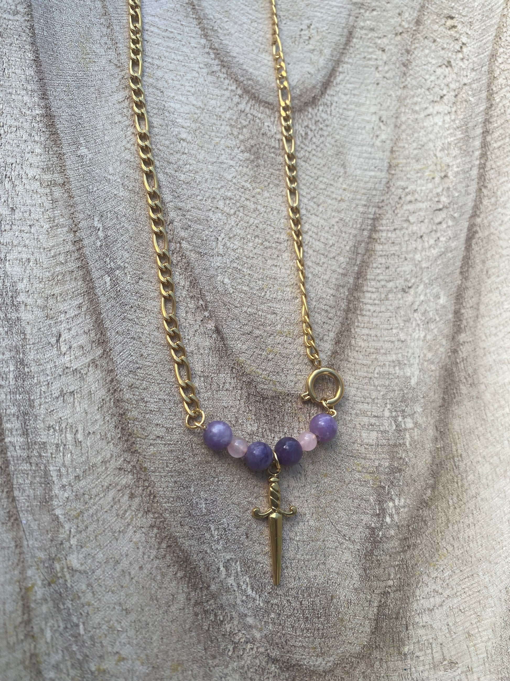Chaîne de 48 cm en acier inoxydable plaqué or 18 carats, avec attache frontale élégante, mettant en valeur des pierres naturelles de lépidolite et de quartz rose. Ce collier allie douceur et force, dans une esthétique affirmée et féminine.
