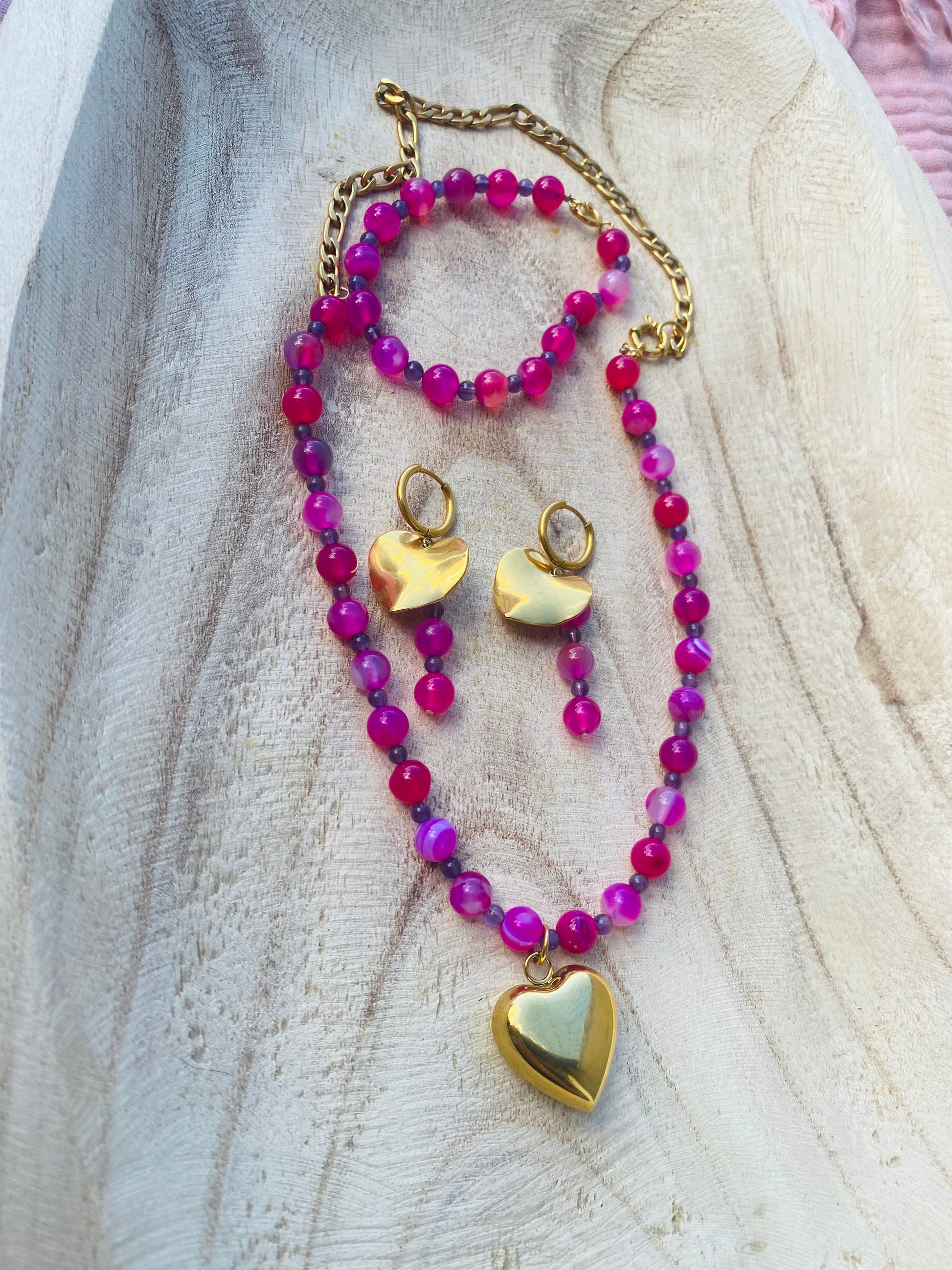 Collier (55 cm), bracelet et boucles d’oreilles en acier inoxydable plaqué or 18 carats, ornés de pierres d’agate colorée fuchsia et de pendentifs en forme de cœur, pour célébrer l’amour sous toutes ses formes.