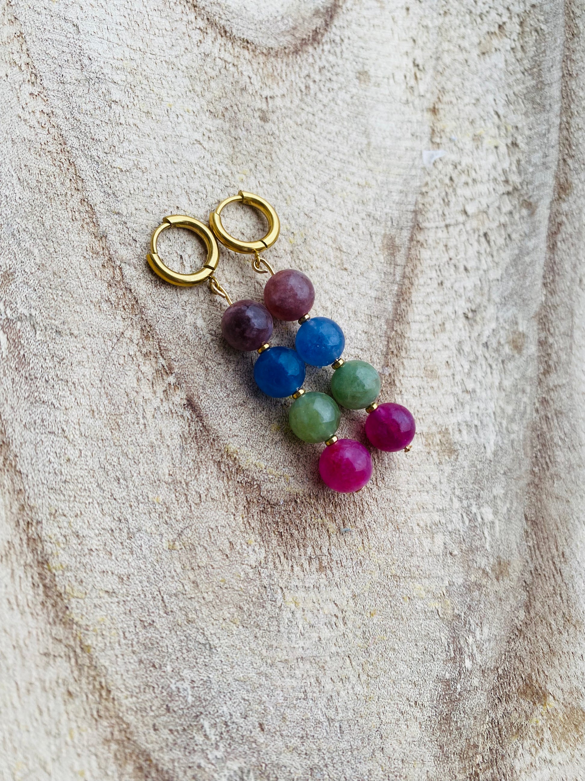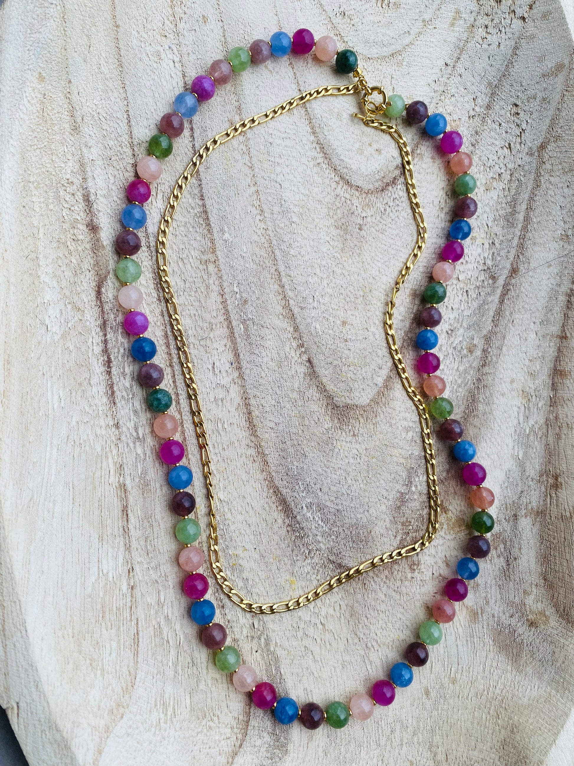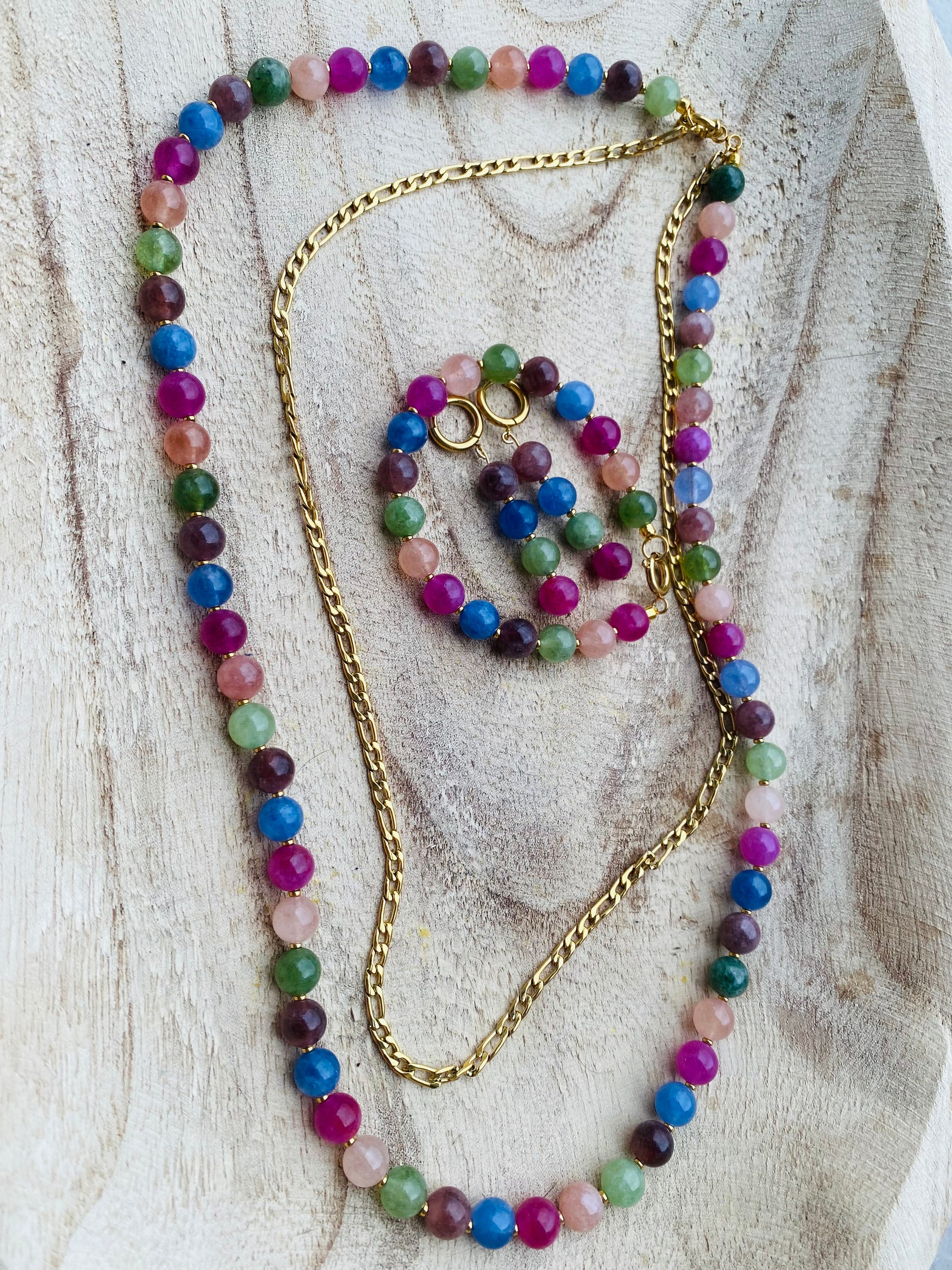 Collier double, bracelet de 17 cm et boucles créoles (1 cm de diamètre) en acier inoxydable plaqué or 18 carats, ornés de perles en pierres de tourmaline aux nuances naturelles et vibrantes.