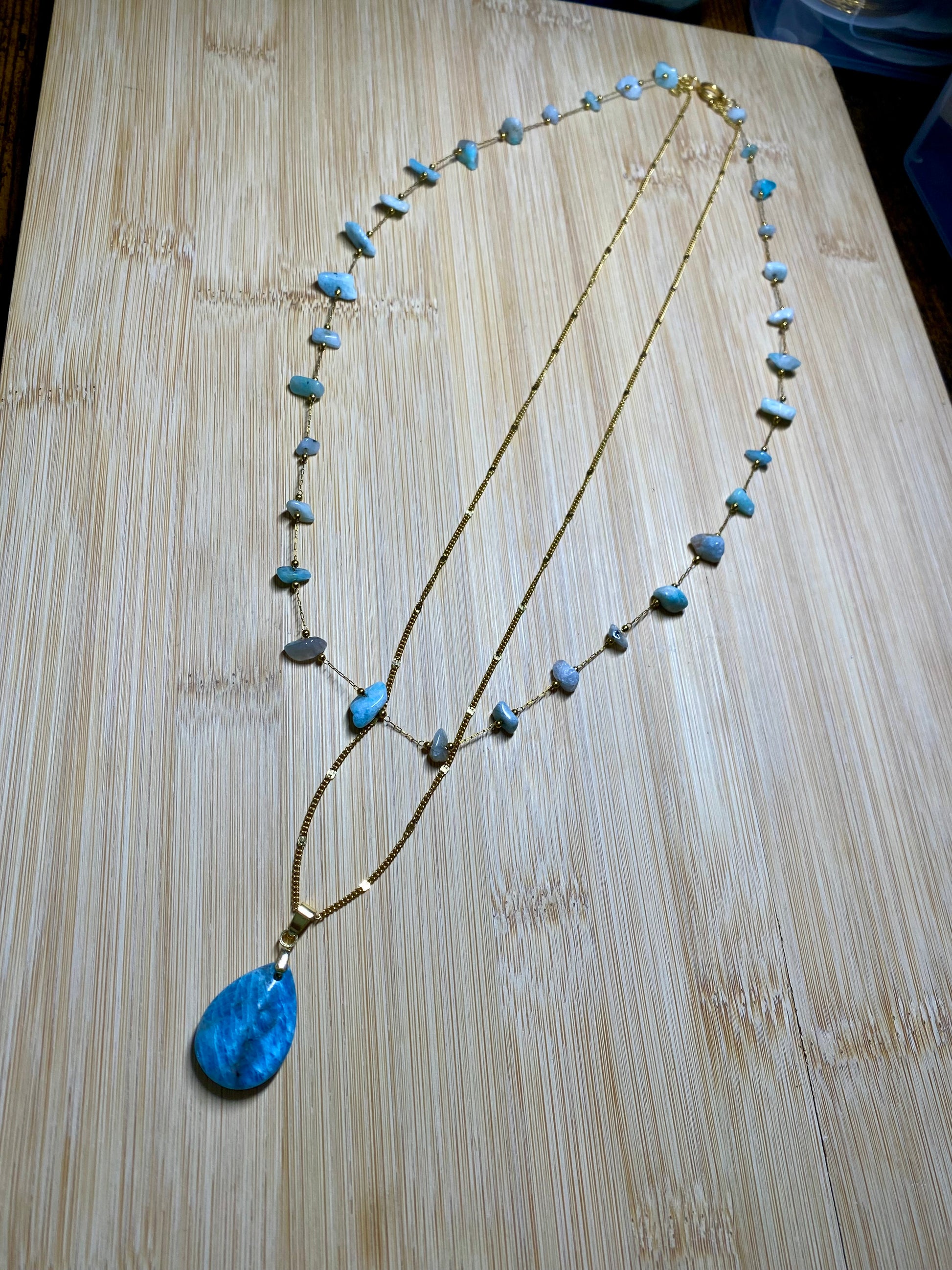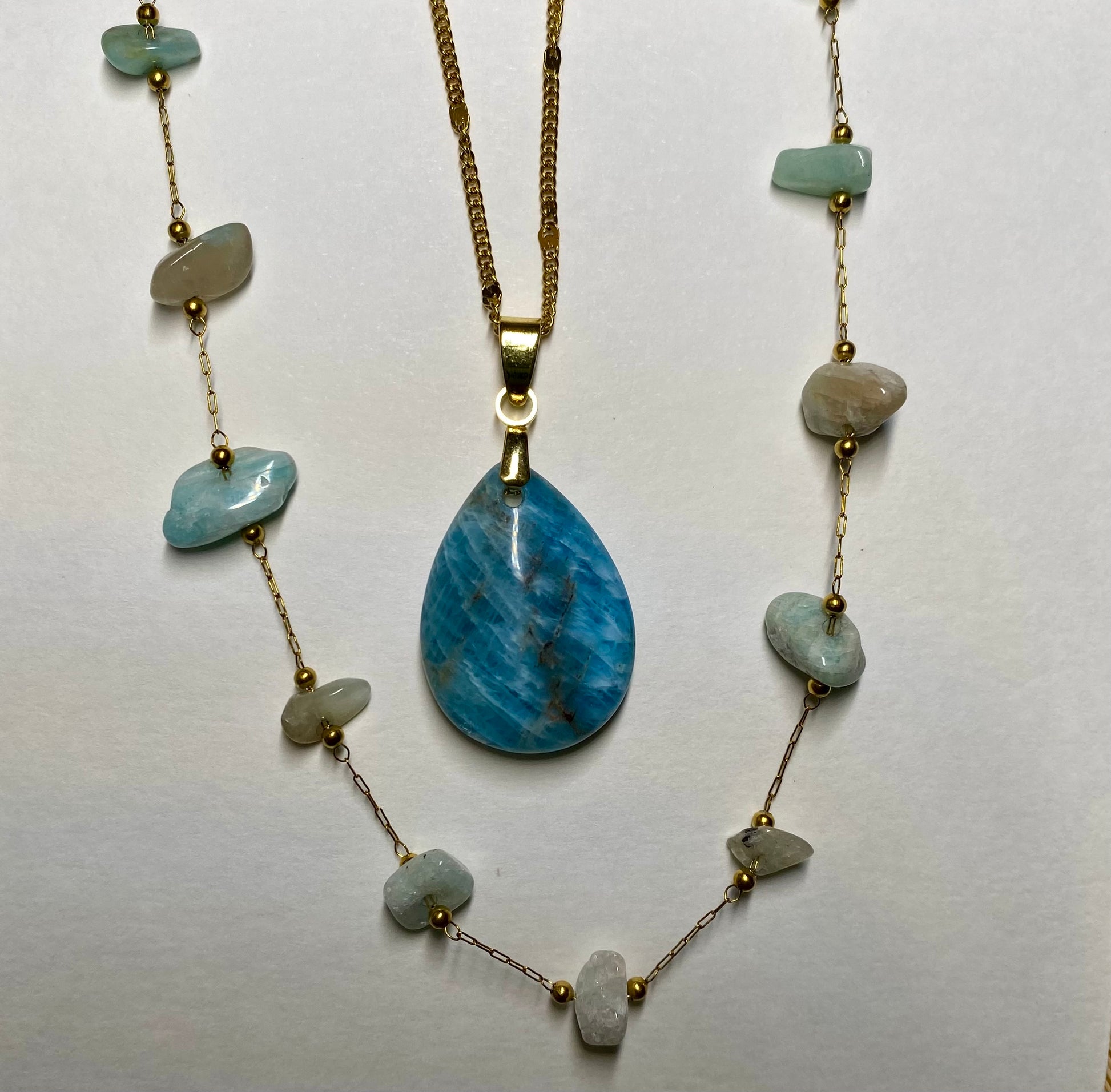 Collier en acier inoxydable plaquĂ© or 18 carats, ornĂ© dâapatite vĂ©ritable et dâune chaĂźne dâamazonite imparfaite, marbrĂ©e de sable et de quartz naturels. Une piĂšce organique, vivante, qui cĂ©lĂšbre la beautĂ© non lissĂ©e du monde.