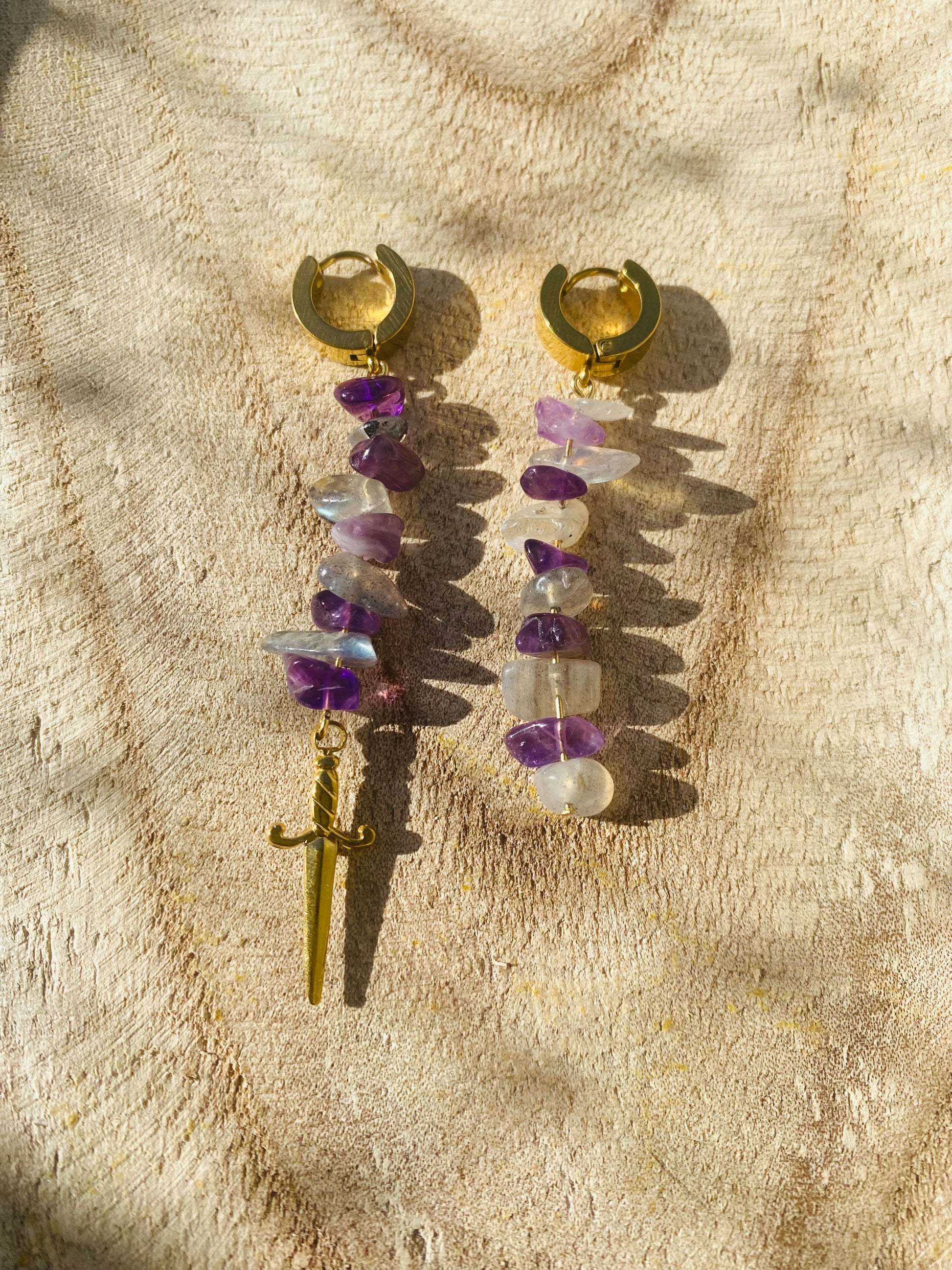 Les boucles d’oreilles d’Hécate se composent de pierres irrégulières d’Améthyste et de Labradorite, accompagnées d’une dague. Boucles dépareillées.