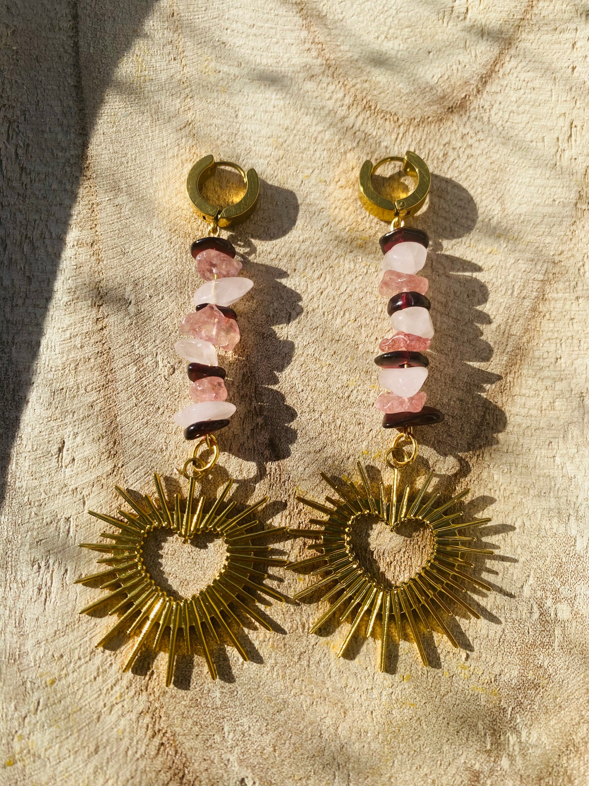 Les boucles d’oreilles d’Orphie se composent de pierres irrégulières de Grenat, de Quartz rose et watermelon, accompagnées de cœurs.