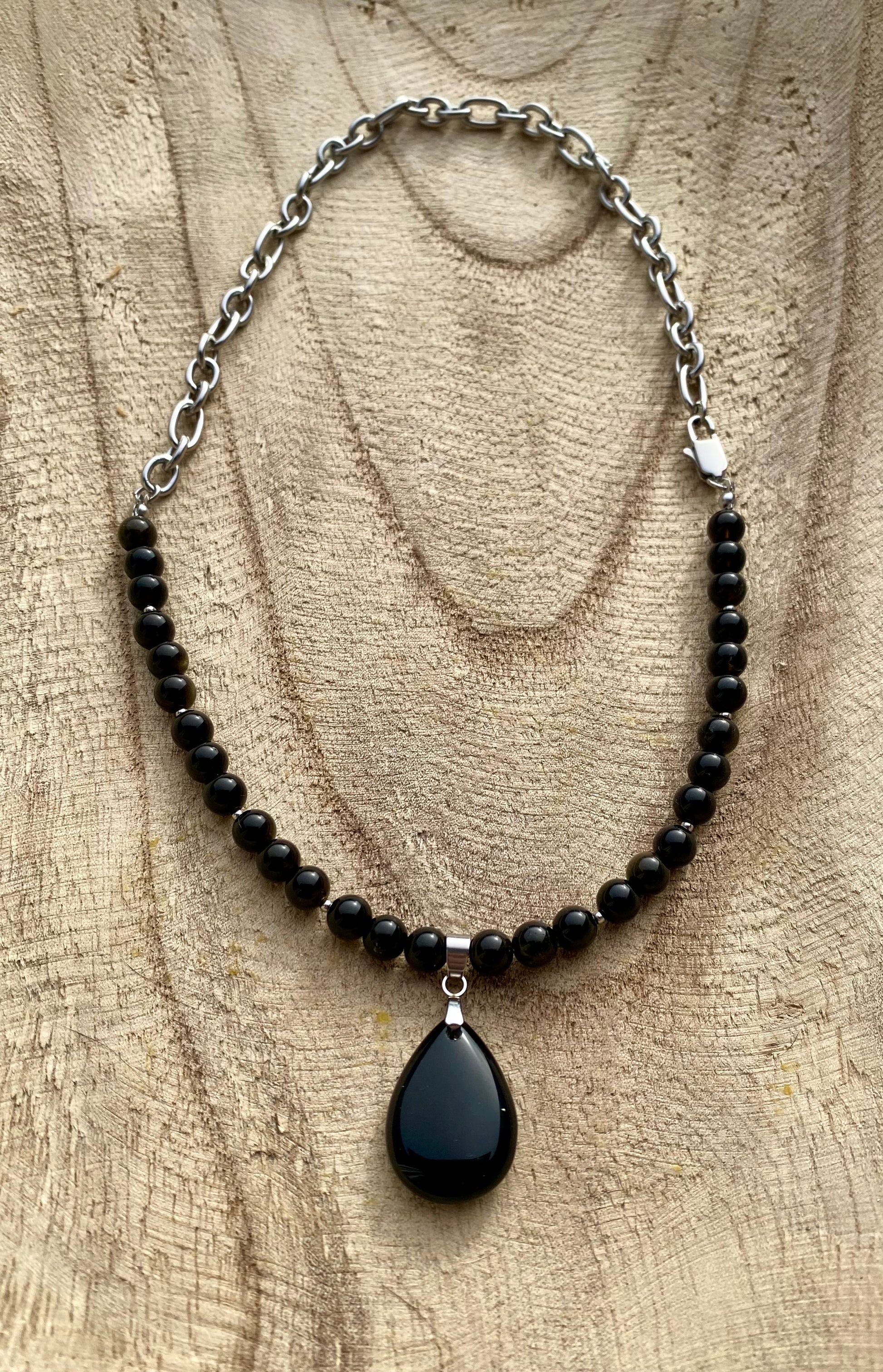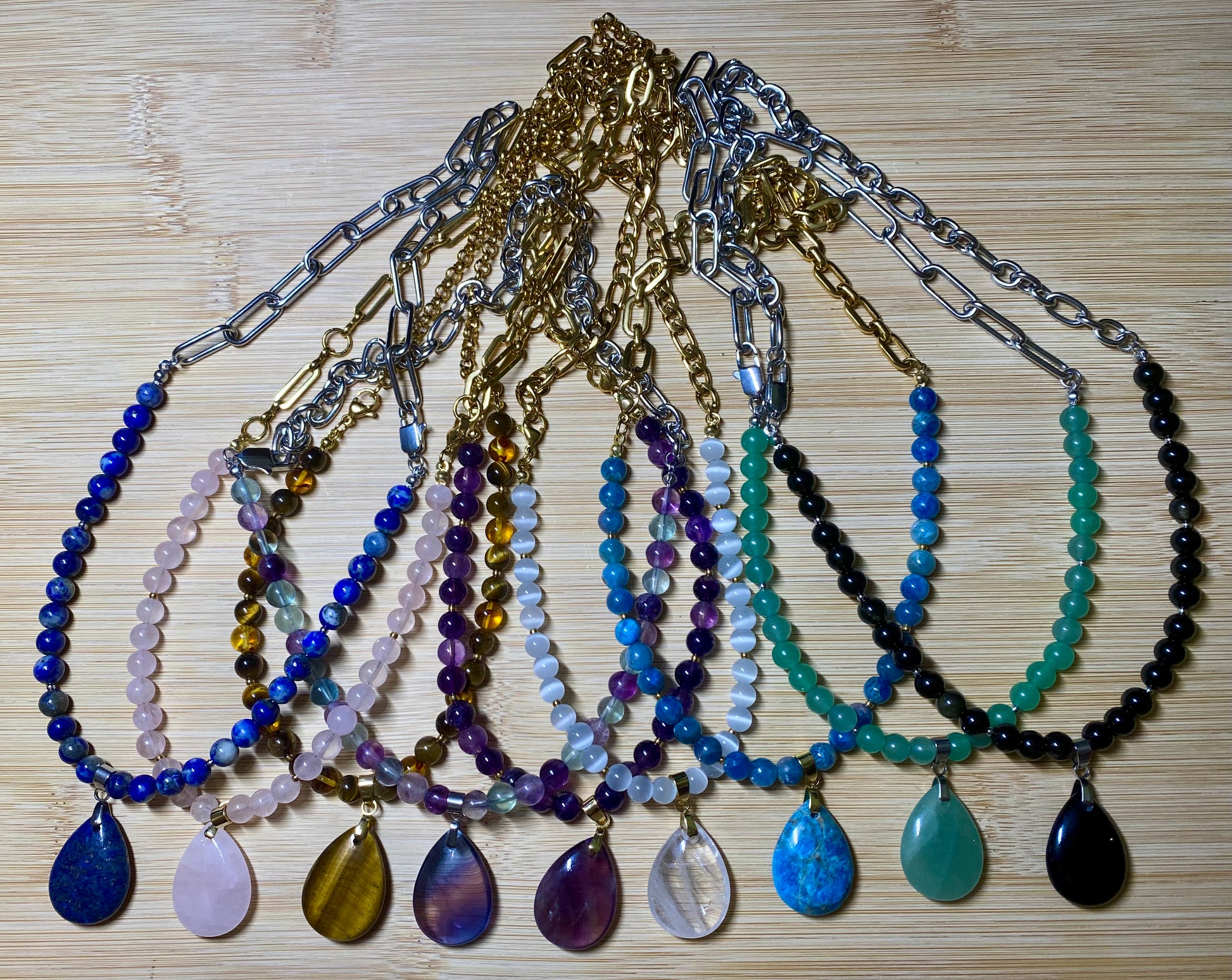 Chaque collier est une pièce unique, composé d’un délicat équilibre entre chaîne en acier inoxydable plaqué or et pierres naturelles, formant un duo harmonieux et contrasté.